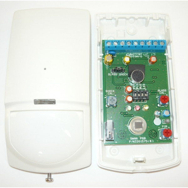 SWAN PGB (Crow) - извещатель охранный совмещённый: объёмный - оптико-электронный (ИК) пассивный с четверным пироэлементом и звуковой (АК) предназначен для обнаружения проникновения в охраняемое закрытое пространство, а также разрушения остеклённых конструкций (в т. ч. стеклопакетов) и формирование извещения о тревоге путем размыкания (НЗ) раздельных 2-ух выходных контактов оптоэлектронных реле.