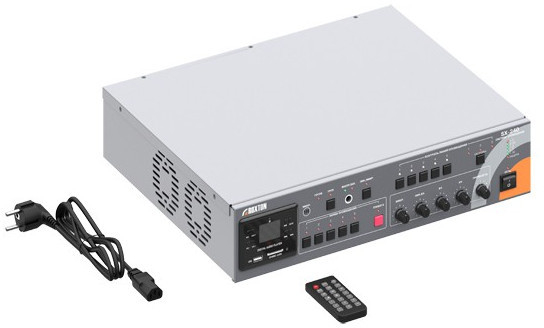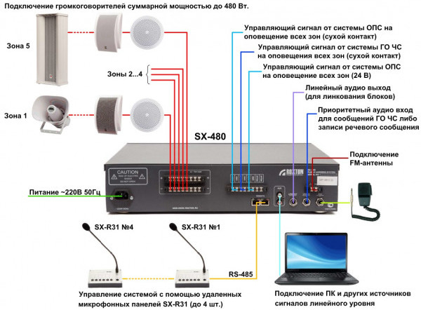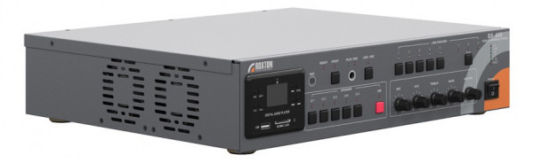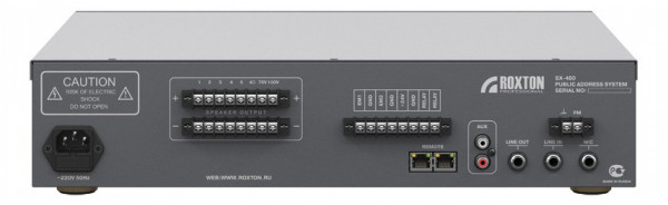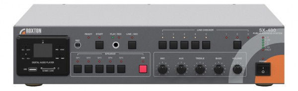SX-480 - комбинированный (моноблок) трансляционный 5-зонный микшер - усилитель выходной мощностью 480 Вт встроенными: проигрывателем MP3/WMA аудиофайлов, FM-тюнером, аудиодекодером, поддержкой внешних USB флеш накопителей и SD/SDHC/MMC карт (до 16 Гб), блоками - цифровых тревожных сообщений и автоматического контроля линий оповещения, возможностью подключения до 4-х микрофонных консолей Roxton SX-R31 по интерфейсу RS-485, наличием светодиодных индикаторов уровня выходного сигнала и срабатывания защиты, предназначен для микширования и усиления звукового сигнала с целью его дальнейшей трансляции на громкоговорители 4 Ом или с питанием 70/100 В.