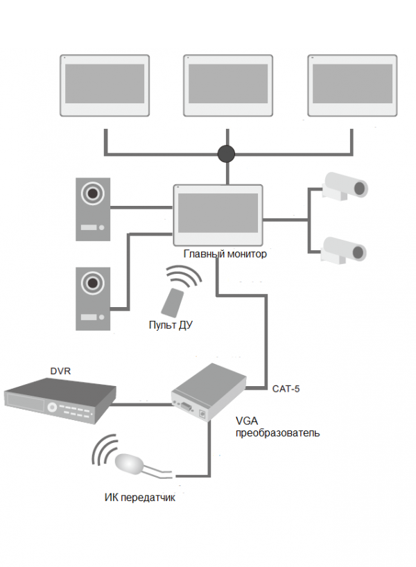 - Подключение внешнего DVR через специальный VGA преобразователь на расстоянии до 50 метров по кабелю UTP-5e с возможностью управления DVR его же пультом дистанционного управления (VGA адаптер поставляется в комплекте с монитором).