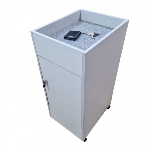 Досмотровая тумба стандартная (стол) с дверью и замком, полками, на пластиковых колесах. Дверь установлена с узкой стороны. Дверь закрывается на ключ. Внутри имеются две полки. Пластиковые колеса со стопором.