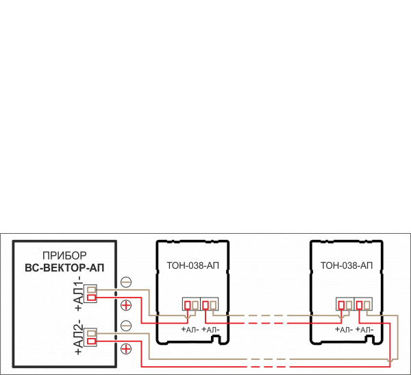 - К адресной линии прибора «ВС-ВЕКТОР-АП250» может быть подключено до 200 оповещателей «ТОН-038-АП».