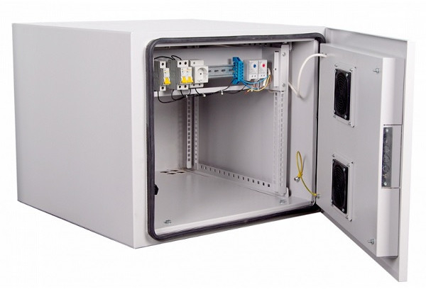 - Для поддержания нормальной температуры эксплуатации без риска повреждения установленного оборудования или нарушения в его работе внутри шкафа установлены вентилятор и электронагревательный элемент, которые активируются при достижении экстремальных значений внутренней температуры; их автоматическим запуском управляют 2 термостата.