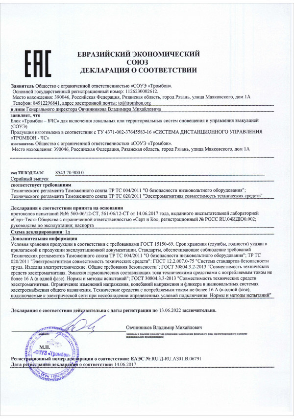 Тромбон-БЧС - сетевой блок удаленного управления системой экстренного оповещения населения предназначен для включения территориальной системы оповещения (ТСО), построенной на базе прибора управления «Тромбон – ПУ-ХХ», в состав автоматизированной системы централизованного оповещения «Тромбон – ЧС».