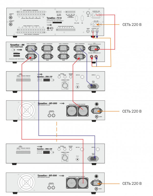 Тромбон-БК - блок коммутации предназначен для управления питанием нескольких усилителей мощности систем речевого оповещения (каскадирование усилителей).