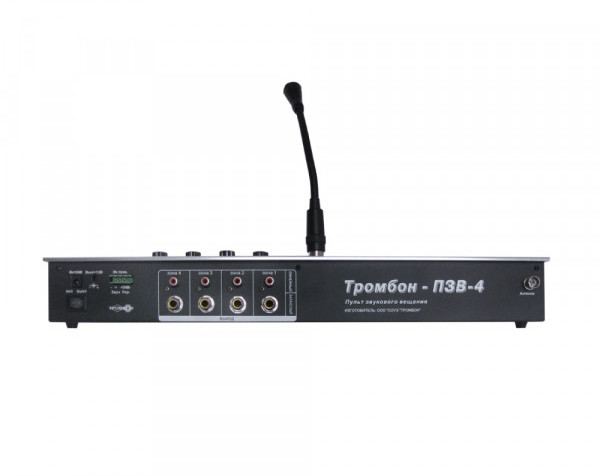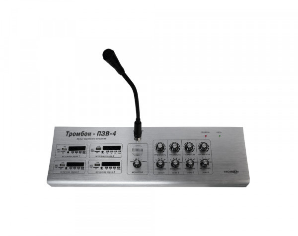 ТРОМБОН-ПЗВ-4 - пульт звукового вещания 4-х канальный предназначен для использования в составе систем оповещения и ведомственных радиоузлов для воспроизведения звуковых программ с различных электронных носителей и приёма сигналов эфирного вещания (FM).