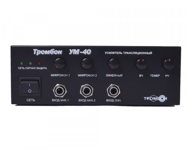 Тромбон-УМ-40 - усилитель малой мощности предназначен для усиления звуковых сигналов при работе в составе систем оповещения людей о пожаре различных зданий.
