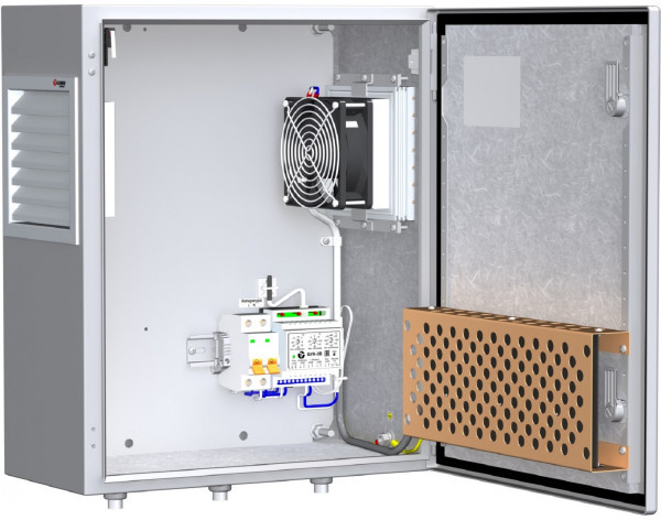 Термошкаф. Класс защиты - IP55. Потребляемая мощность 102Вт. Напряжение питания 220В 15 AC, 6A. Габариты - 400x500x210. Диапазон температур от -50 С +50 C.