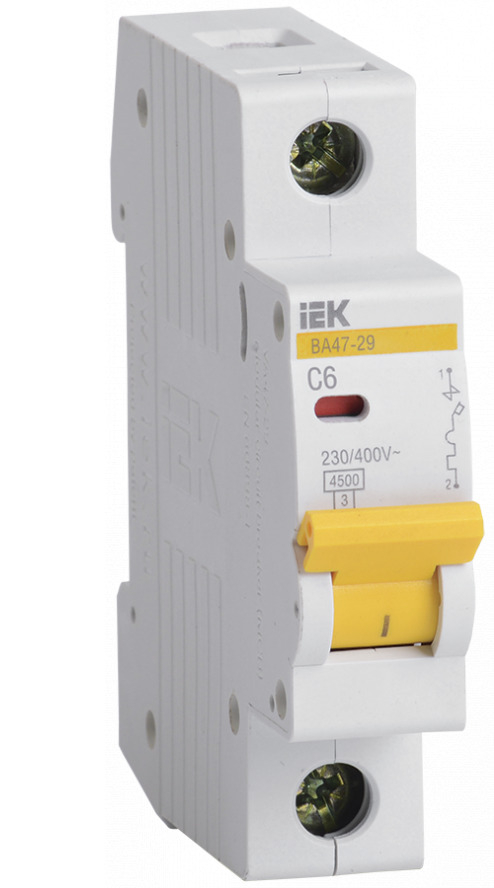 ВА47-29 1Р 6А 4,5кА С IEK - автоматический 1-полюсной выключатель на 6А постоянного/переменного напряжения с характеристикой C и креплением на DIN-рейку для защиты вводно-распределительных и групповых цепей жилых и общественных зданий, двигателей с небольшими пусковыми токами (компрессор, вентилятор и т.д.)