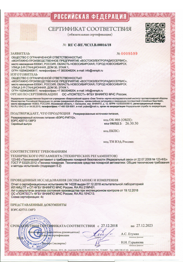 ВЭРС-РИП12 предназначен для обеспечения бесперебойным электропитанием средств охранно-пожарной сигнализации (ОПС) и иных потребителей напряжением 12В постоянного тока.