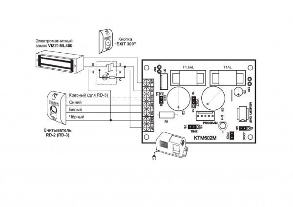 VIZIT-KTM602R - контроллер электронных ключей в исполнении: блок управления KTM602M и считыватель RD-4R предназначен для управления электромагнитным или электромеханическим замком с сопротивлением обмотки не менее 10 Ом с помощью кнопки разблокировки замка ("ВЫХОД") и электронных ключей-идентификаторов VIZIT-RF2.x.