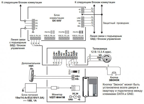 - возможность подключения одного БВД, кнопки "Звонок", дополнительной телекамеры и дополнительного УКП при работе без блока коммутации монитора;