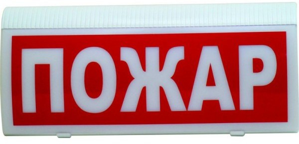 При пожаре оповещатель подсвечивает табло с надписью «ПОЖАР» мигающим белым светом, информируя о произошедшем возгорании и необходимости покинуть помещение.