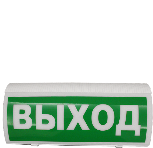 При пожаре оповещатель подсвечивает табло с надписью «ВЫХОД» мигающим белым светом, информируя о выходе из помещения.