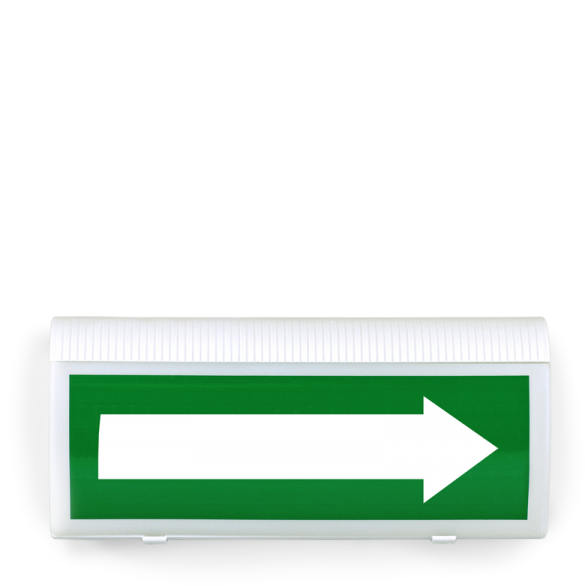 При пожаре оповещатель подсвечивает табло с указателем «СТРЕЛКА ВПРАВО» мигающим белым светом, информируя о выходе из помещения.