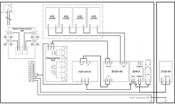 - блок переключения питания с зарядным устройством БПЗУ-48 предназначен для создания системы бесперебойного питания с использованием внешнего источника питания 48В DC и подключенных последовательно 12 В аккумуляторных батарей (АКБ типа DTM1207 - 4шт.);