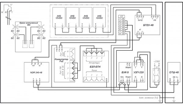 - блок переключения питания с зарядным устройством БПЗУ-48 предназначен для создания системы бесперебойного питания с использованием внешнего источника питания 48В DC и подключенных последовательно 12 В аккумуляторных батарей (АКБ типа DTM1207 - 4шт.);