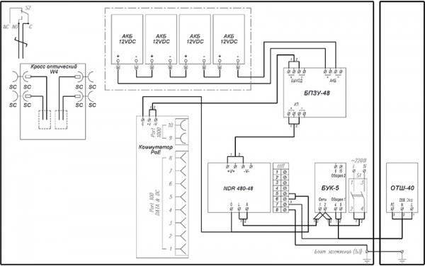 - блок переключения питания с зарядным устройством БПЗУ-48 предназначен для создания системы бесперебойного питания с использованием внешнего источника питания 48В DC и подключенных последовательно 12 В аккумуляторных батарей (АКБ типа DTM1207 - 4шт.);