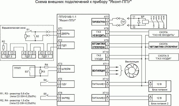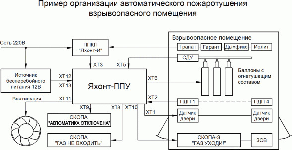 Яхонт ППУ - прибор искробезопасный управления (от выходного сигнала ППКОП) электрозапускаемой установкой газового, порошкового или аэрозольного пожаротушения 1-ой взрывоопасной зоны в автоматическом или ручном (дистанционном) режимах, взрывозащищённый (ExiаGaIIB), но с установкой вне взрывоопасной зоне, степенью защиты (IP20), напряжением 2-ух раздельных входов питания (10 - 14,2 В).