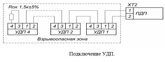 К данному ППУ подключаются по 2-ух проводной линии связи от 1-го до 4-ёх взрывозащищённых (0ExiaIIBT6Ga) устройств дистанционного пуска (УДП - приобретаются отдельно), устанавливаемых во взрывоопасных зонах.