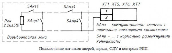 В искробезопасный шлейф контроля дверей могут подключаться серийные пассивные (нетокопотребляющие) охранные извещатели магнитоконтактного типа, либо иные датчики положения дверей (кнопки, переключатели и т.п.), разрешенные к применению во взрывоопасных зонах.