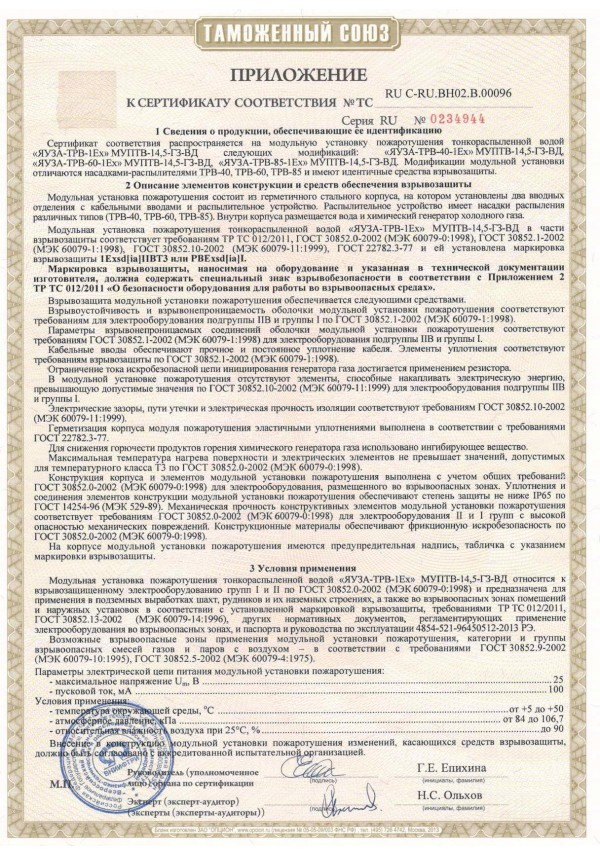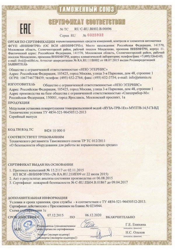 Модуль пожаротушения тонкораспыленной водой взрывозащищенный, классы А и В, эл.оборуд. до 1000В, Iпуск 100мА, +5 +50 С, 1Еxds[ia]IIBT4/ РВExds[ia]I
