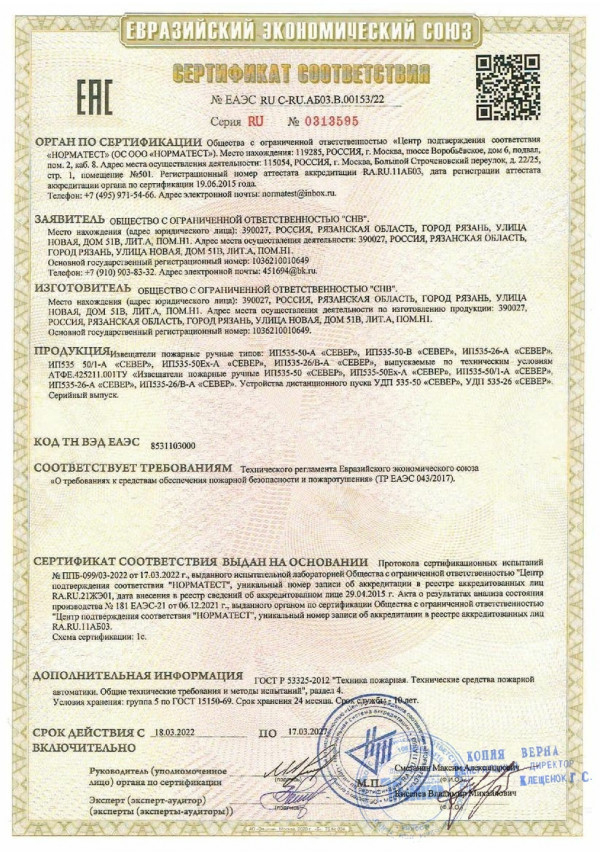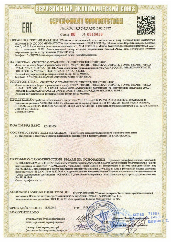 УДП соответствует требованиям НПБ 70-98, НПБ 58-97, ПАШК.425211.127ТУ и ГОСТ Р 53325-2012, имеет сертификат соответствия.