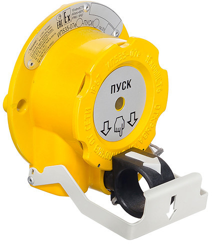 УДП ИП535-07е ПУСК И1 (жёлтый) РМРС - устройство ручное дистанционного пуска взрывозащищенноё судовое, жёлтого цвета, с активацией двойным действием, (НО) контактом, степенью защиты (IP67), с надписью - "Пуск" предназначено для запуска исполнительных механизмов систем пожаротушения, дымоудаления и т.п. при выдергивании приводного элемента и применяется на предприятиях химической, нефтегазодобывающей, нефтегазоперерабатывающей, судостроительной отраслей и взрывоопасных зонах других производств.