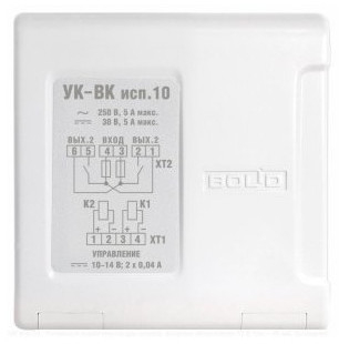 Устройство коммутационное УК-ВК в системах охранной сигнализации и контроля доступом предназначено для коммутации исполнительных устройств (ламп, сирен, видеокамер, электромагнитных замков и т.д.) в сети переменного тока номинальным напряжением 220 В или в цепях постоянного тока до 30 В путём замыкания, размыкания и переключения контактов реле. В системах пожарной сигнализации устройство предназначен для передачи стартового импульса на прибор пожарный управления.