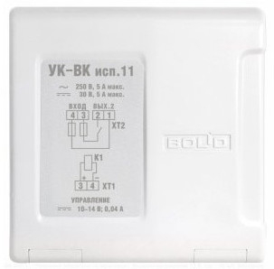 Устройство коммутационное УК-ВК в системах охранной сигнализации и контроля доступом предназначено для коммутации исполнительных устройств (ламп, сирен, видеокамер, электромагнитных замков и т.д.) в сети переменного тока номинальным напряжением 220 В или в цепях постоянного тока до 30 В путём замыкания, размыкания и переключения контактов реле. В системах пожарной сигнализации устройство предназначен для передачи стартового импульса на прибор пожарный управления.