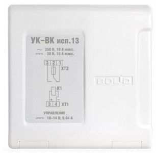 Устройство коммутационное УК-ВК в системах охранной сигнализации и контроля доступом предназначено для коммутации исполнительных устройств (ламп, сирен, видеокамер, электромагнитных замков и т.д.) в сети переменного тока номинальным напряжением 220 В или в цепях постоянного тока до 30 В путём замыкания, размыкания и переключения контактов реле. В системах пожарной сигнализации устройство предназначен для передачи стартового импульса на прибор пожарный управления.