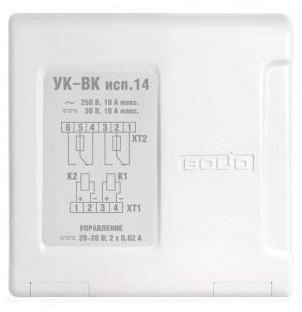 Устройство коммутационное УК-ВК в системах охранной сигнализации и контроля доступом предназначено для коммутации исполнительных устройств (ламп, сирен, видеокамер, электромагнитных замков и т.д.) в сети переменного тока номинальным напряжением 220 В или в цепях постоянного тока до 30 В путём замыкания, размыкания и переключения контактов реле. В системах пожарной сигнализации устройство предназначен для передачи стартового импульса на прибор пожарный управления.