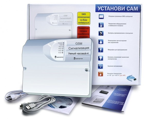 Умный Часовой-4 - прибор GSM-сигнализации (встроенный модуль) имеет 4 входа для подключения различных датчиков, 2 входа для подключения термодатчиков типа DS18B20, для подключения активного микрофона и динамика - по 1 входу, а также 4 выхода (2 - открытый коллектор; 2 - силовое реле 220В х 10А).