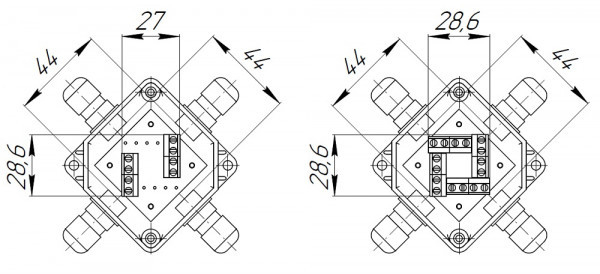 УС-4-Ех (4х4) - с клеммными колодками и количеством соединительных разъемов - (4х4) и количеством гермовводов - 2 шт.