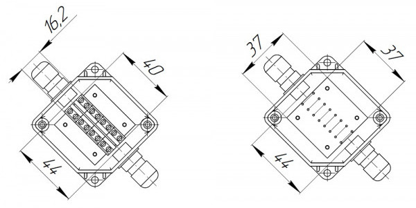 УС-4-Ех (4х4) - с клеммными колодками и количеством соединительных разъемов - (4х4) и количеством гермовводов - 2 шт.