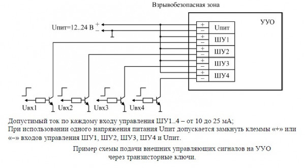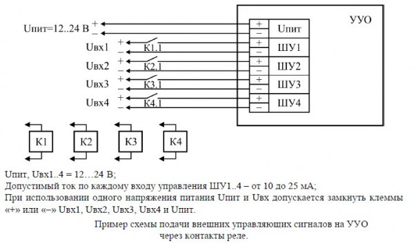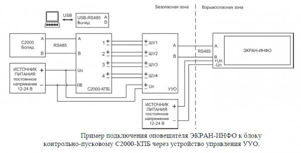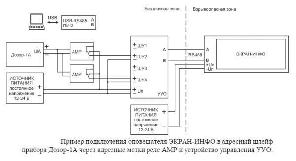 УУО - внешнее устройство управления (располагается вне взрывоопасной зоны) со степенью защиты (IP54) для подключения только оповещателя "ЭКРАН-ИНФО" к дискретным выходам (реле и другим исполнительным устройствам) пожарных пультов или контроллеров управления, что позволяет заменить подключение до 4-х отдельных оповещателей.