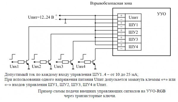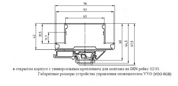 УУО-RGB (DIN) - внешнее устройство управления на DIN-рейку (располагается вне взрывоопасной зоны) со степенью защиты (IP41) для подключения только оповещателя "ЭКРАН-ИНФО-RGB" к дискретным выходам (реле и другим исполнительным устройствам) пожарных пультов или контроллеров управления, что позволяет заменить подключение до 4-х отдельных оповещателей.