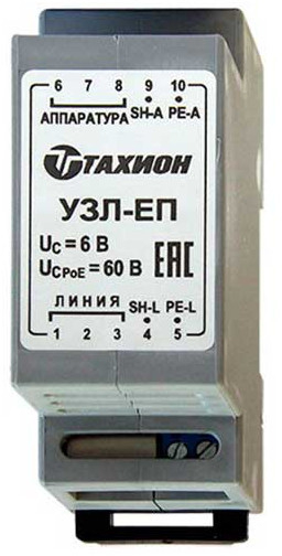 УЗЛ-ЕП - устройство защиты информационных портов Ethernet сетевого оборудования от импульсных перенапряжений, возникающих в результате атмосферных разрядов (грозозащита) или действия индустриальных помех, а также защиты портов с функцией питания PoE.