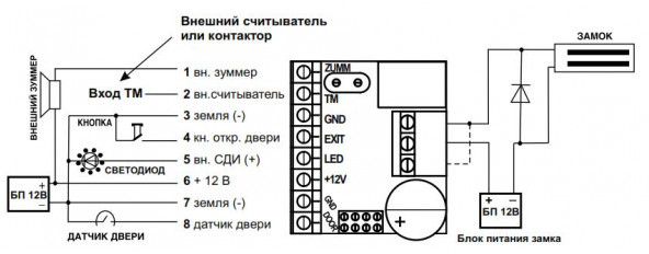- Выход для подключения запорного устройства: реле (тип 1С).