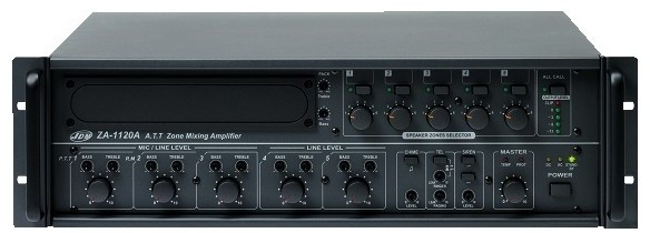 ZA-1120A - трансляционный настольный и встраиваемый в 19" стойку/шкаф 5-зонный с 6-и ступенчатыми аттенюаторами микшер - усилитель выходной мощностью 120 Вт, встроенными: вентилятором охлаждения, 2-х полосным эквалайзером, генератором сигналов "Гонг" и "Сирена", наличием функции телефонного пейджинга и ночного вызова предназначен для микширования и усиления звукового сигнала с целью его дальнейшей трансляции на громкоговорители 4 Ом или с питанием 70/100 В.
