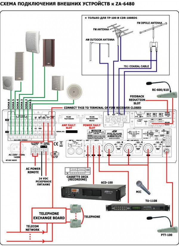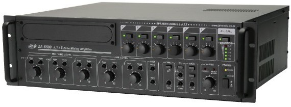 ZA-6120 - трансляционный настольный и встраиваемый в 19" стойку/шкаф 6-зонный с 6-и ступенчатыми аттенюаторами микшер - усилитель выходной мощностью 120 Вт, встроенными: вентилятором охлаждения, 2-х полосным эквалайзером, генератором сигналов "Гонг" и "Сирена", наличием функции телефонного пейджинга и ночного вызова предназначен для микширования и усиления звукового сигнала с целью его дальнейшей трансляции на громкоговорители 4 Ом или с питанием 70/100 В.