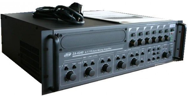 ZA-6240 - трансляционный настольный и встраиваемый в 19" стойку/шкаф 6-зонный с 6-и ступенчатыми аттенюаторами микшер - усилитель выходной мощностью 240 Вт, встроенными: вентилятором охлаждения, 2-х полосным эквалайзером, генератором сигналов "Гонг" и "Сирена", наличием функции телефонного пейджинга и ночного вызова предназначен для микширования и усиления звукового сигнала с целью его дальнейшей трансляции на громкоговорители 4 Ом или с питанием 70/100 В.