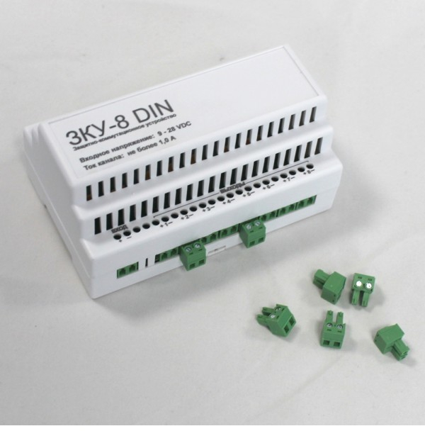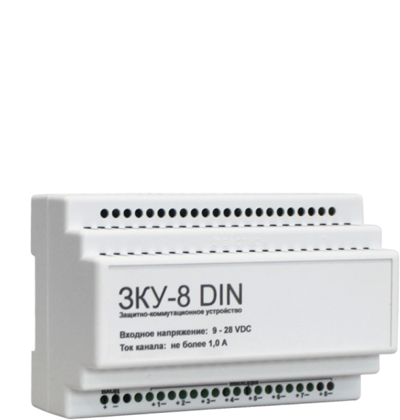 ЗКУ - 8 DIN - защитно-коммутационное устройство для коммутации и защиты от КЗ линии питания 9 - 28 В, 8 каналов по 1 А; быстроразъемные клеммы для удобства монтажа; самовосстанавливающиеся предохранители в каждом канале, индикация по каждому каналу.