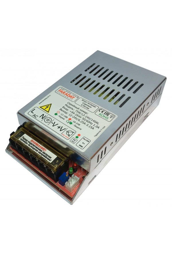 Выходная мощность-75 Вт.Регулируемое выходное напряжение 12 24 В.Выходной ток 6,25 А на 12 В 3,12 А на 24 В.Входное напряжение 94 В...264 В.Индикация-два светодиода. C DIN-рейкой.