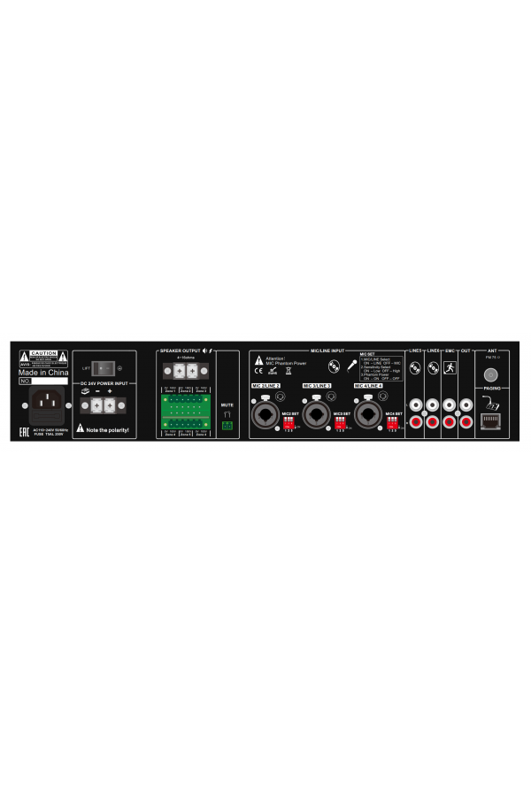 Усилитель имеет богатое оснащение различными разъёмами. 6 аудиовходов: 3 комбинированных, линейные/микрофонные, небалансные, 1 микрофонный (балансный) с приоритетностью - когда сигнал поступает от него, остальные глушатся - и 2 линейных (небалансные). Максимальная приоритетность задана вспомогательному входу EMC (2RCA), который наряду с исполнительным реле MUTE ("сухой контакт", блокирует трансляцию) отвечает за интеграцию системы звукофикации объекта в системы ответственные за ГО и ЧС. Аудиовыходы: 1 линейный 2RCA, для внешнего устройства, например, рекордера и винтовые зажимы для акустики 4-16 Ом + Euroblock для зональной акустики 100В.