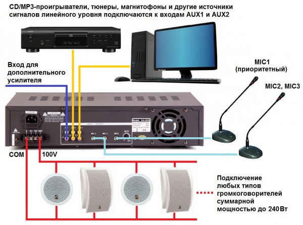 AA-240 - трансляционный 1-зонный микшер - усилитель выходной мощностью 240 Вт предназначен для микширования и усиления звукового сигнала с целью его дальнейшей трансляции на громкоговорители 8 Ом или с питанием 70/100 В.