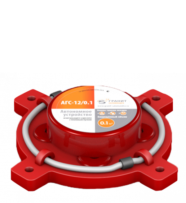 АГС-12/0,1 - автономное устройство огнетушащего аэрозоля с тепловым пуском предназначен для генерирования газоаэрозольной смеси, необходимая объемная концентрация которой останавливает процесс пламенного горения защищаемого объёма - 0,1 м3 очагов возгораний и пожаров классов А (твердых горючих веществ), В (жидких горючих веществ), Е (электроустановок, находящихся под напряжением до 40 кВ).