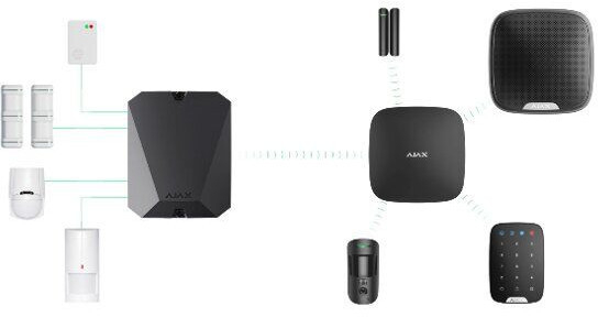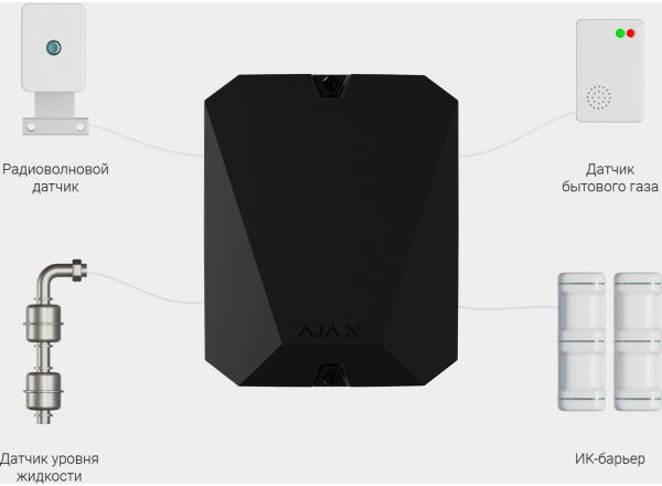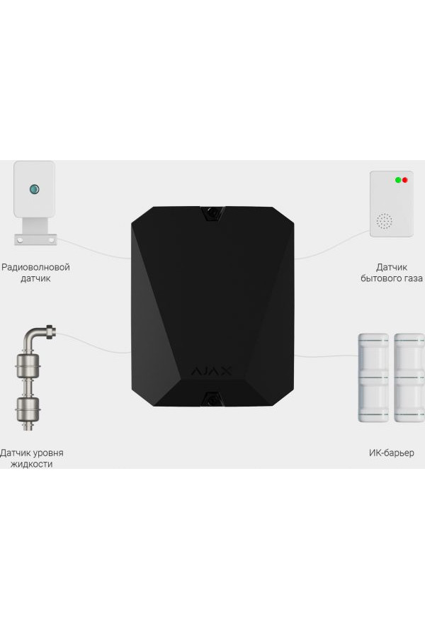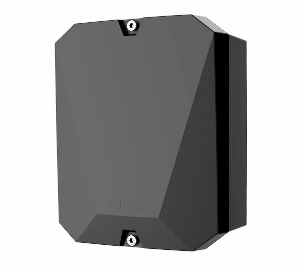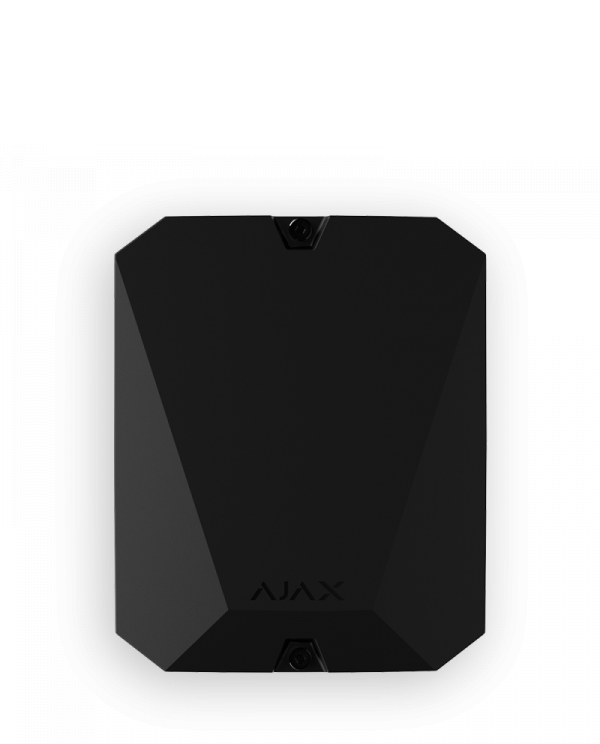Ajax MultiTransmitter (black) - радиоканальный Jeweller (868 МГц) модуль (в корпусе чёрного цвета) для подключения к системе безопасности Ajax (только хабам и ретрансляторам) любых 18 сторонних устройств с проводным выходом (уличных и комнатных - датчиков движения, ИК-барьеров, датчиков уровня жидкости и утечки газа, термореле и др.) и удалённого их управления.