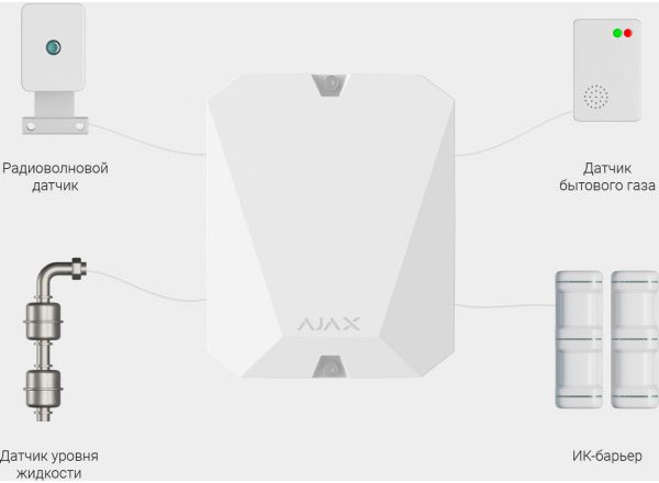 Ajax MultiTransmitter (white) - радиоканальный Jeweller (868 МГц) модуль (в корпусе белого цвета) для подключения к системе безопасности Ajax (только хабам и ретрансляторам) любых 18 сторонних устройств с проводным выходом (уличных и комнатных - датчиков движения, ИК-барьеров, датчиков уровня жидкости и утечки газа, термореле и др.) и удалённого их управления.