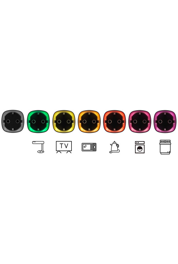 Электророзетка имеет счетчик энергопотребления и LED-индикацию уровня нагрузки (в виде изменения свечения светодиодного контура корпуса).