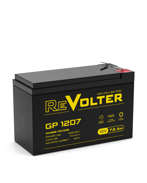 Свинцово-кислотный AGM аккумулятор Revolter GP 1207 производится напряжением 12В и ёмкостью 8.14 Ач по технологии VRLA. Корпус выполнен из ударопрочного пластика и надежно герметизирован, обслуживание (долив воды) на протяжении всего срока эксплуатации не требуется. Внутри него расположены микропористые стекловолоконные сепараторы, удерживающие электролит в неподвижном состоянии. Односторонний клапан избыточного давления находится на крышке и сбрасывает избыточное давление газа в атмосферу. Revolter GP 1207 подходит для использования как в буферном, так и в циклическом режиме: срок эксплуатации составляет 5 лет или 1200 циклов при DOD = 30%. Разрядные характеристики выше на 8% на коротких и длинный интервалах. В сравнении с конкурентами аккумулятор Revolter GP 1207 обладает большей емкостью при тех же габаритах.